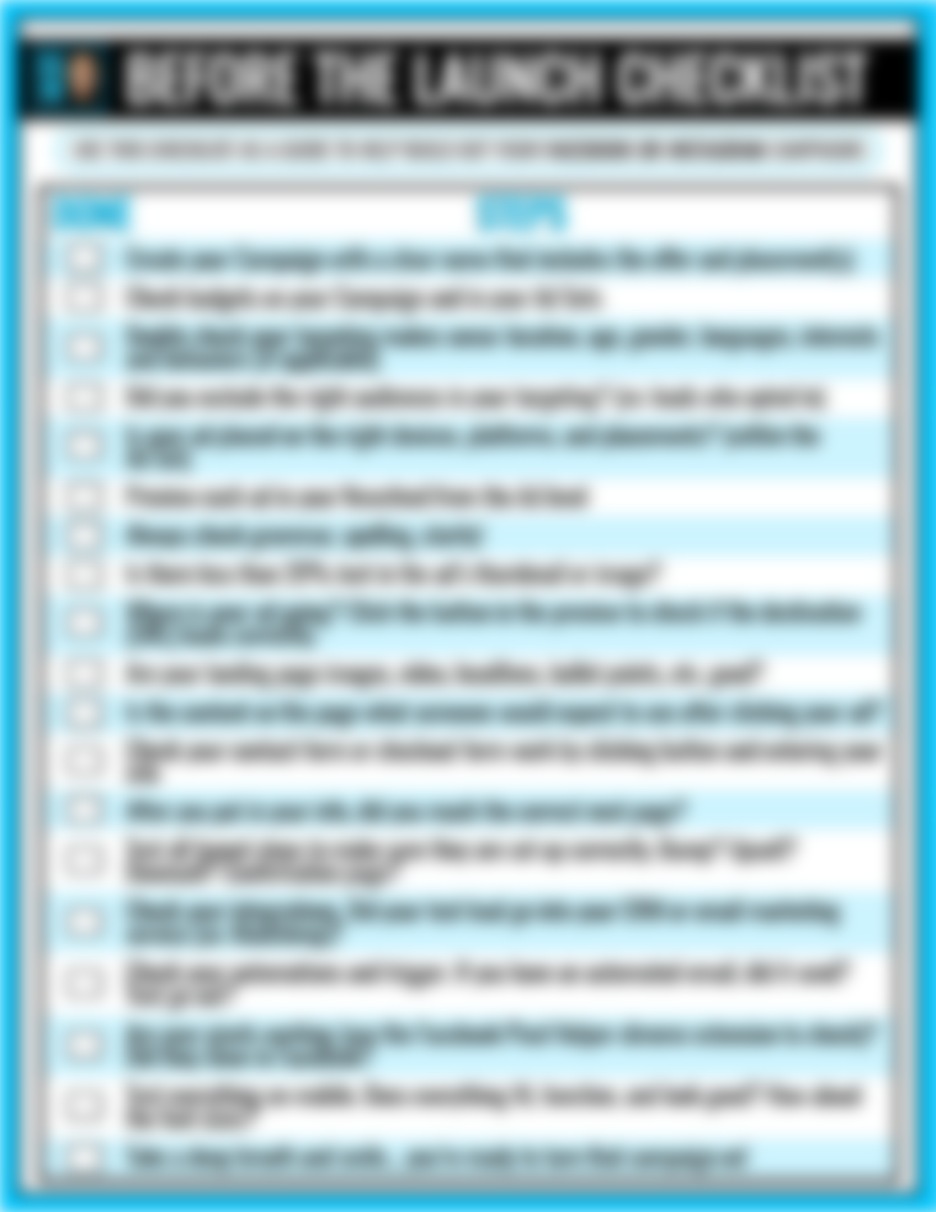 • Before the Launch Checklist - For Facebook Ads. Use this checklist to make sure your Facebook ad is created properly so you can turn your ad on with confidence.
