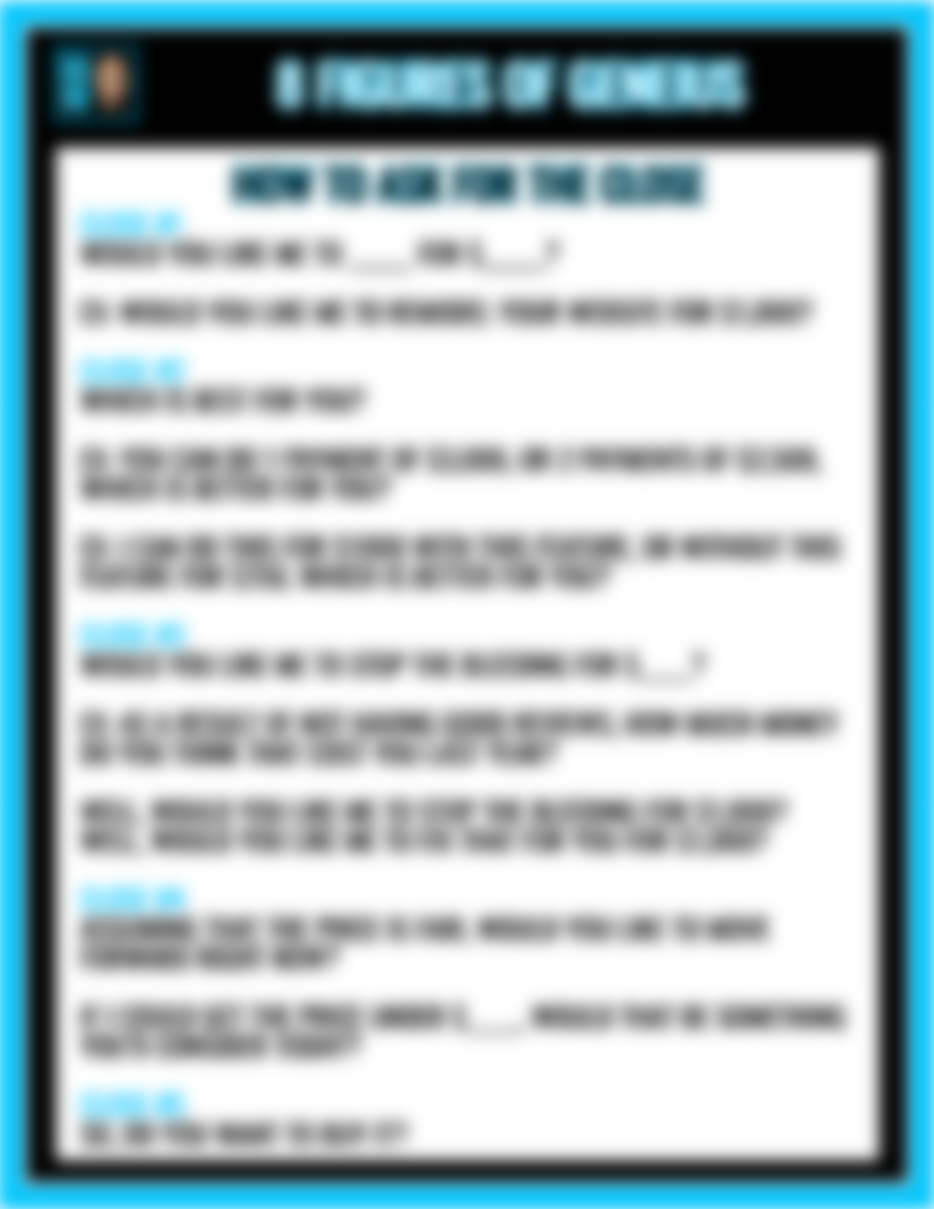 • My "How To Ask For The Close" Script. Use these 5 different "closes" to make the sale without sounding pushy, fearful, or talking too much and ruining the sale.