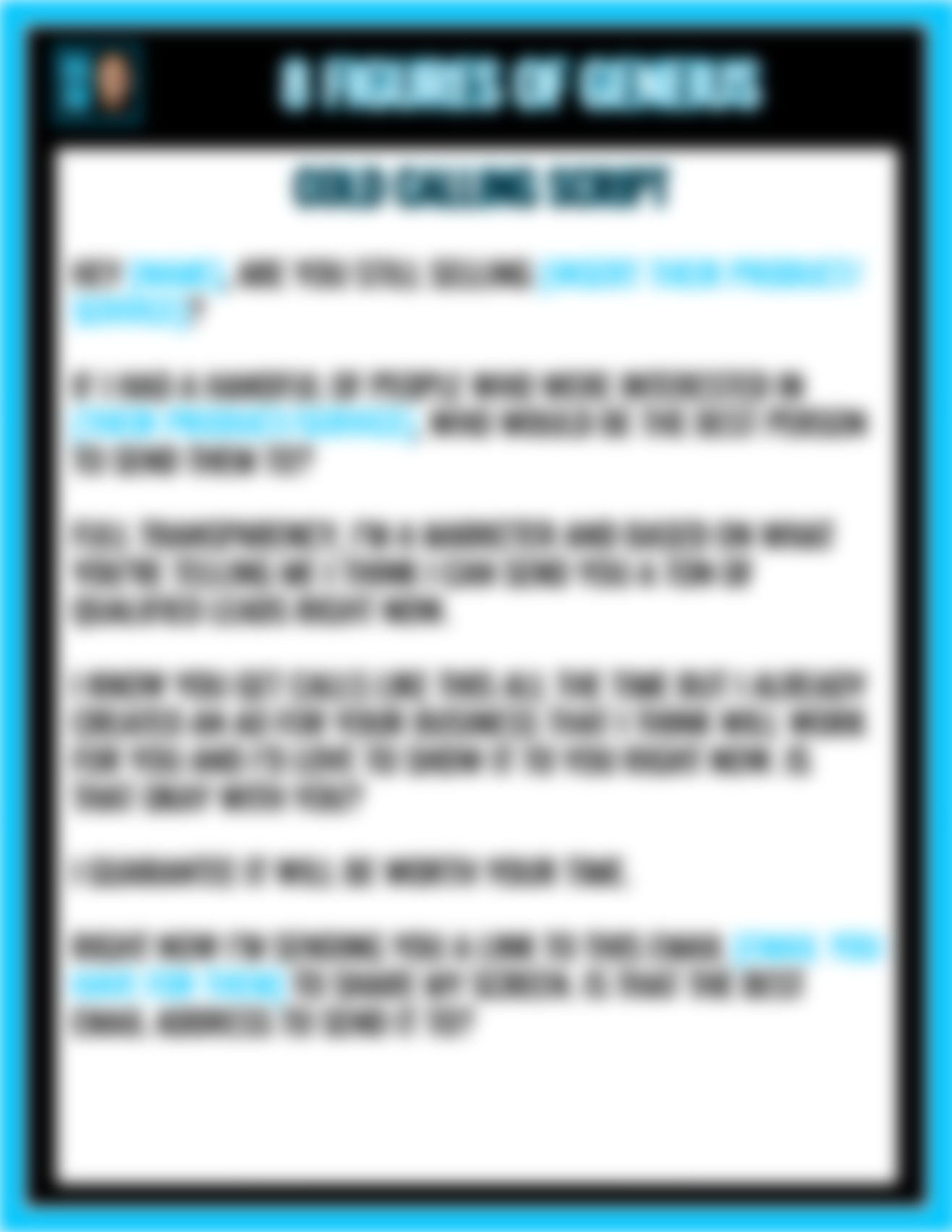 • My Best "Cold Calling" Script. Picking up the phone and dialing someone you don't know can be scary... but not when you have this script! Use this to get a complete stranger excited to talk to you.