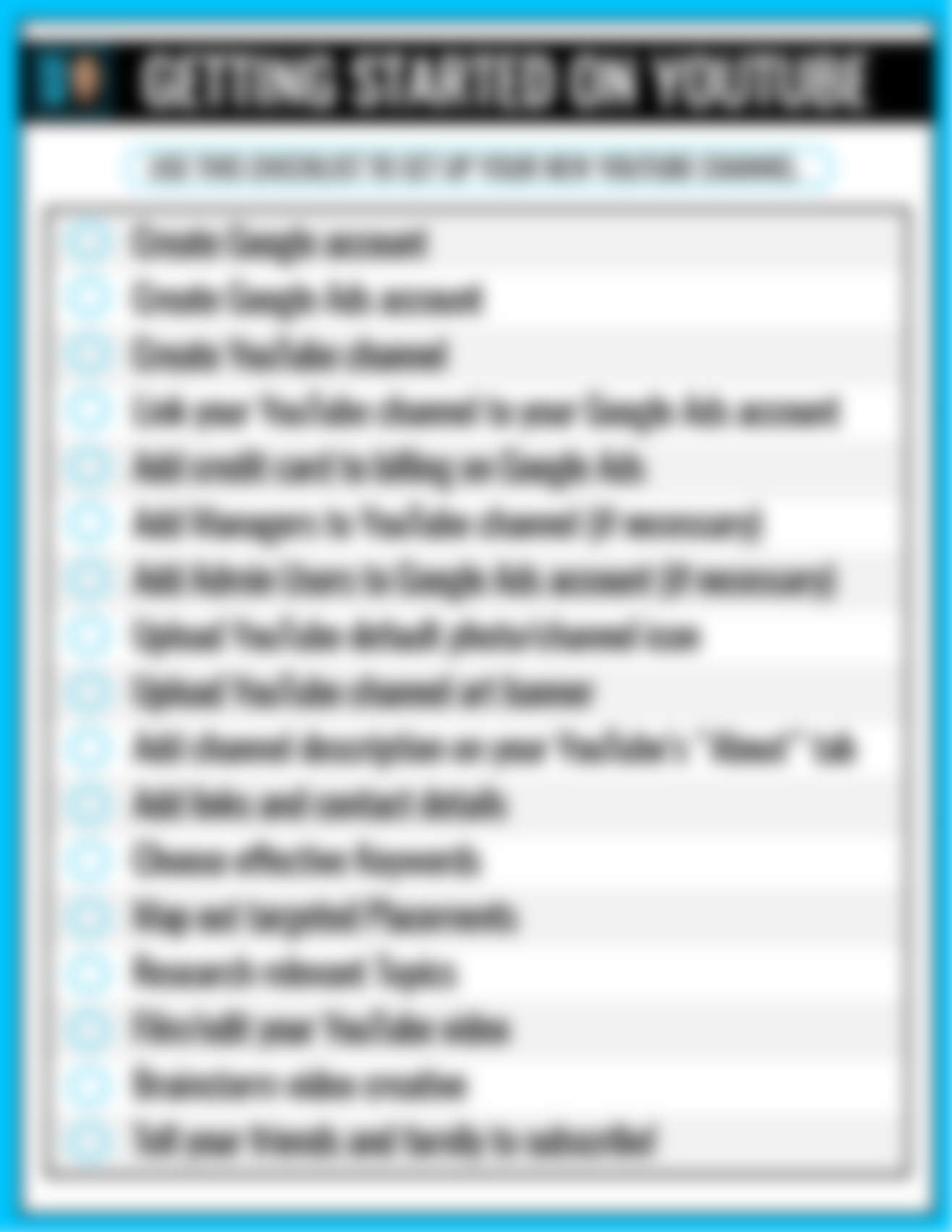 • Getting Started With YouTube Ads Checklist. Brand new to YouTube? Use this and check off all the steps needed before you can start creating an ad.