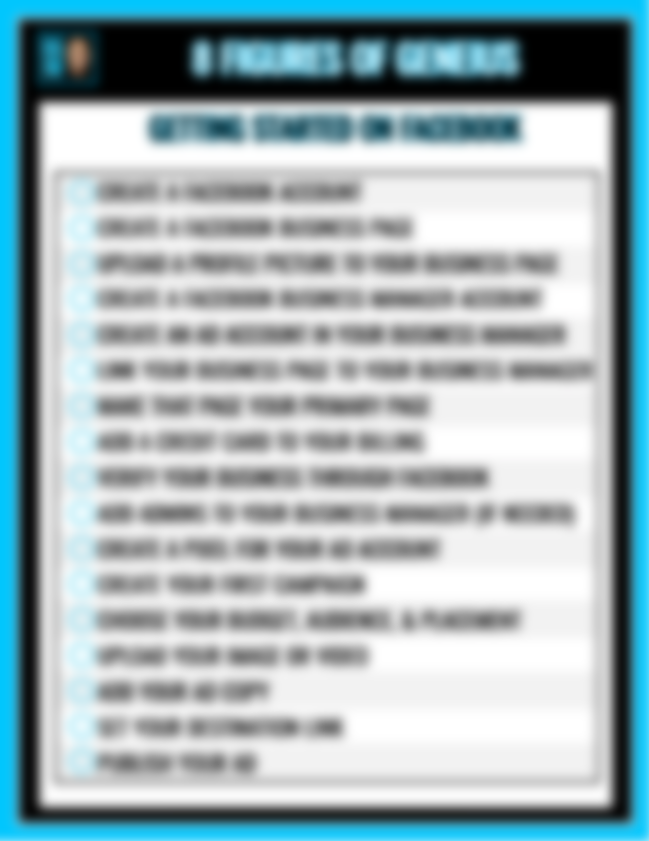 • Getting Started With Facebook Ads Checklist. Brand new to Facebook advertising? Check off all these steps before you try to create an ad.