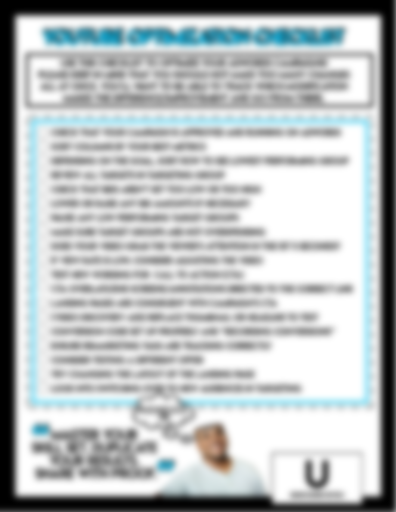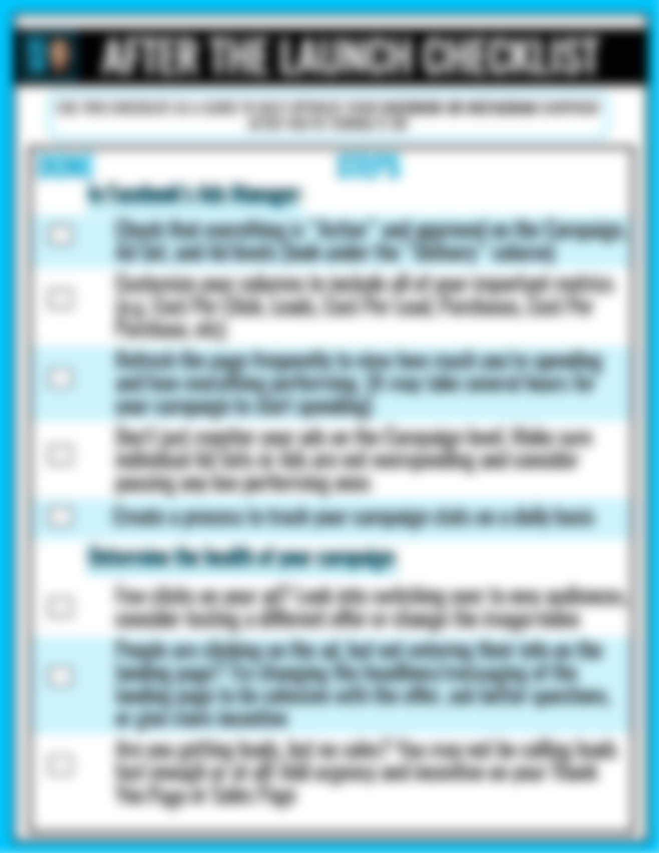 • After the Launch Checklist - For Facebook Ads. Once your ad starts spending, do you know what to do next? How can you tell if it's performing good or bad? Use this!