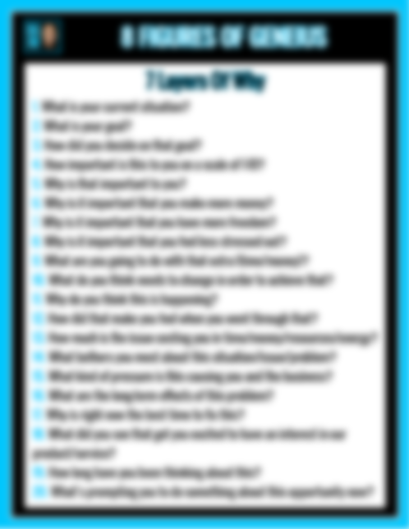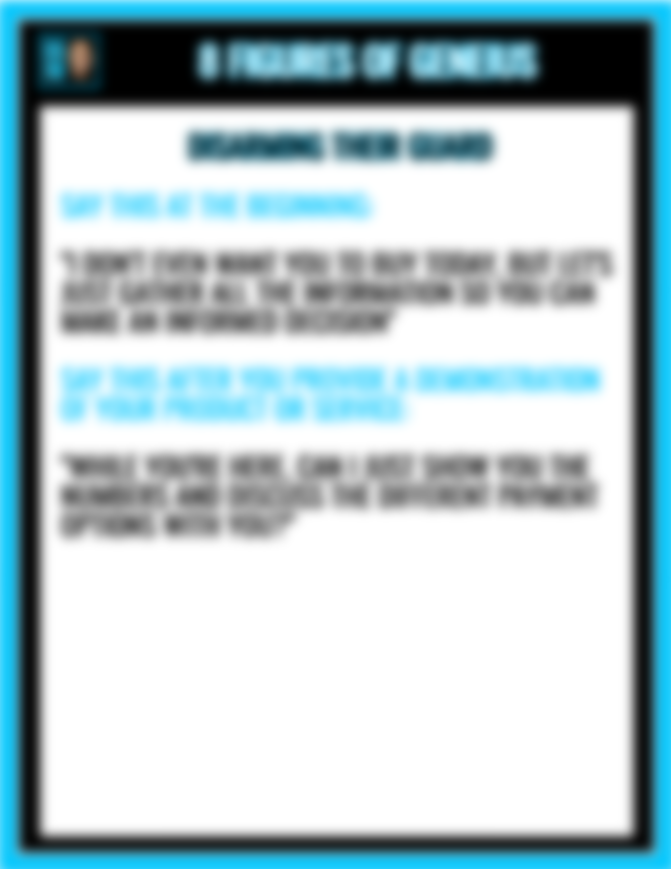 • My "Ask The Right Questions" Script. Ask these questions and you'll never have to ask for the sale. They'll ask you.