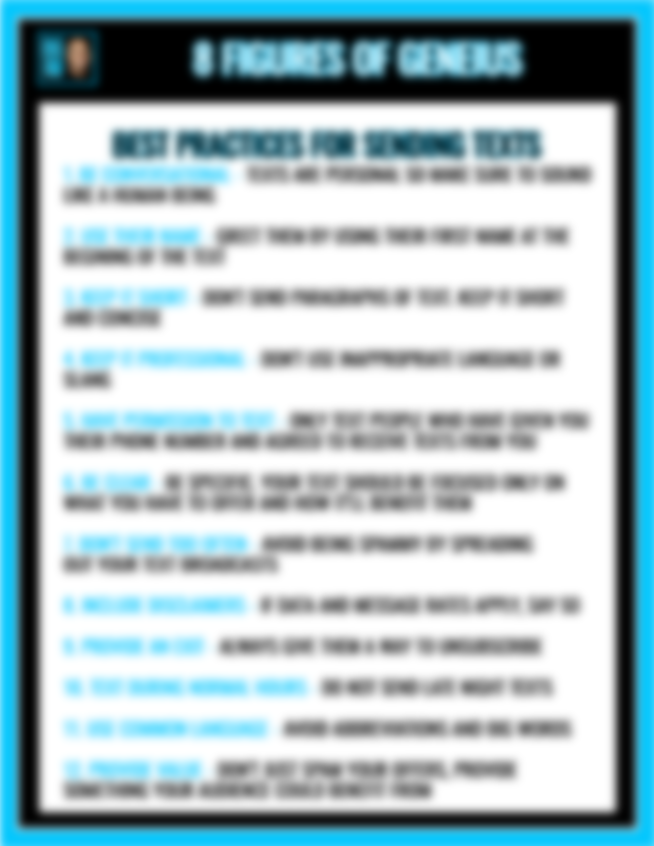 • I'll even give you our cheat sheet of best practices when sending texts to keep your customers happy and you out of trouble.