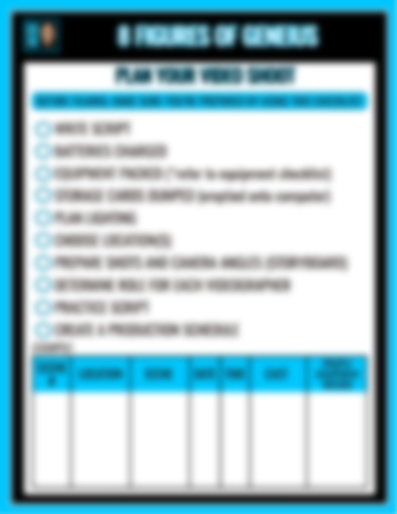 • Plan Your Video Shoot Checklist. Before hitting record, make sure you're prepared by using this.