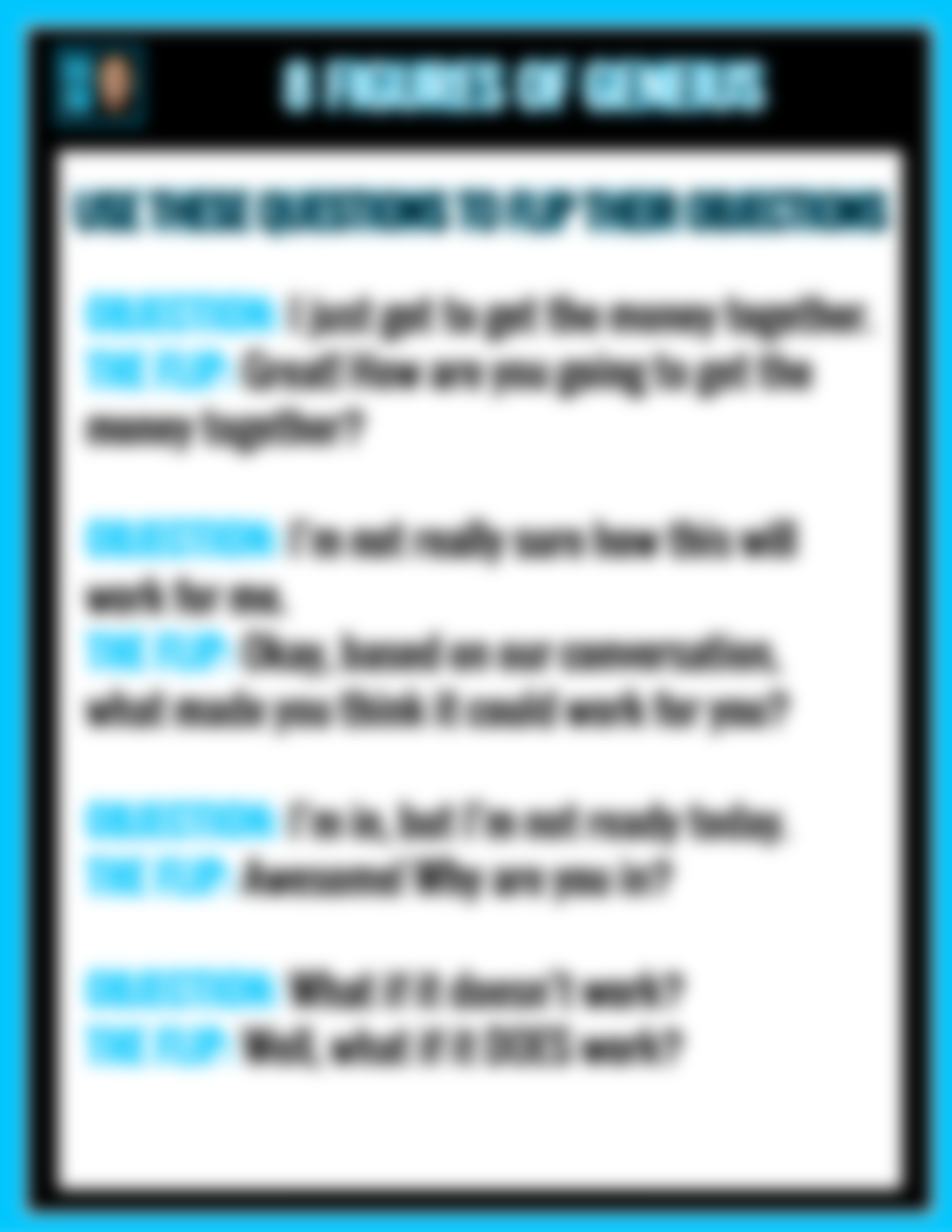 • My "Flipping Objections" Script. Use these 1-liners when someone drops an objection. These will allow you to overcome the BS and win the sale.